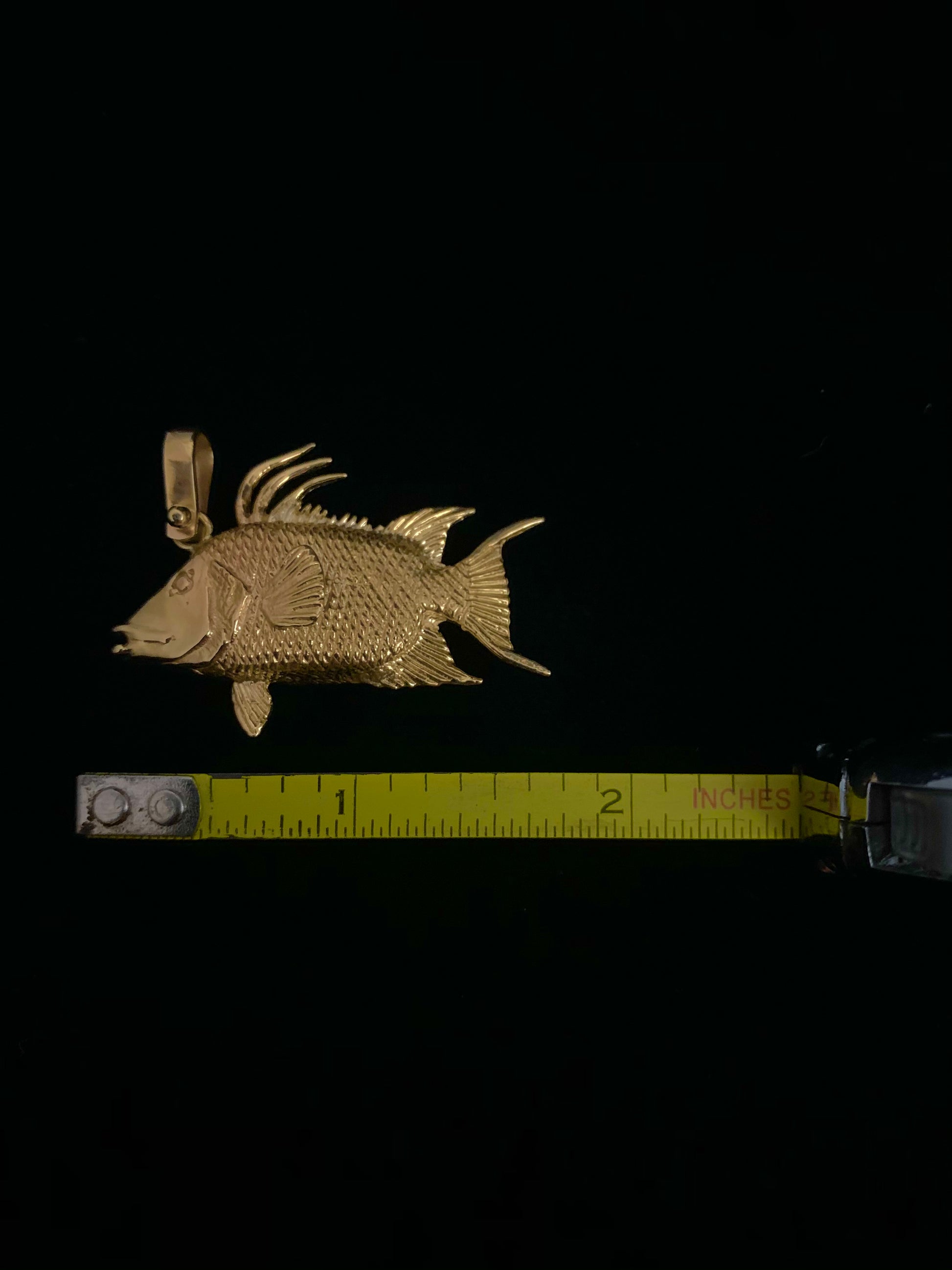 This uniquely cast Hogfish Pendant is handmade in the 14 Karat Yellow Gold. The pendant has a hollow back and features a freely-moving shackle bail. The Hogfish has been a notoriously elusive fish. Often avoiding being fished by pole, these Hogfish are tricky to catch and delicious to eat, which makes them a very rewarding catch!