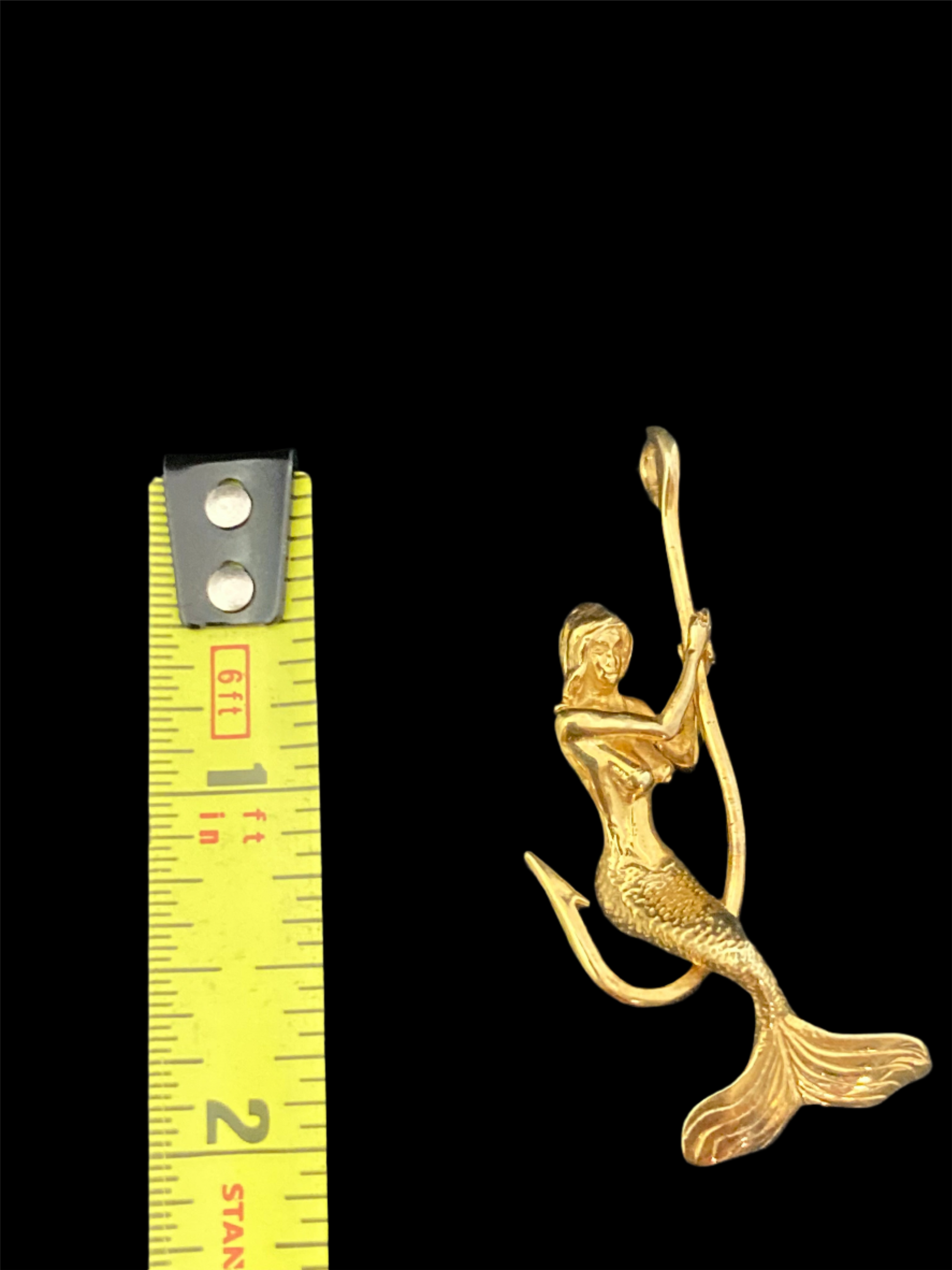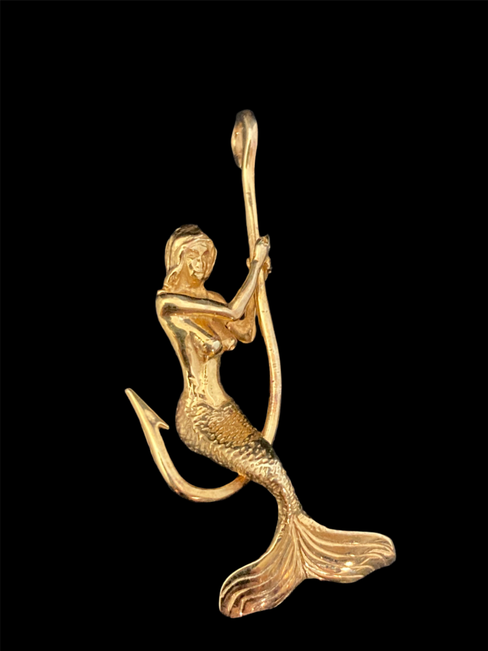 Solid 14 Karat Yellow Gold Mermaid Sitting on a Fishing Hook.