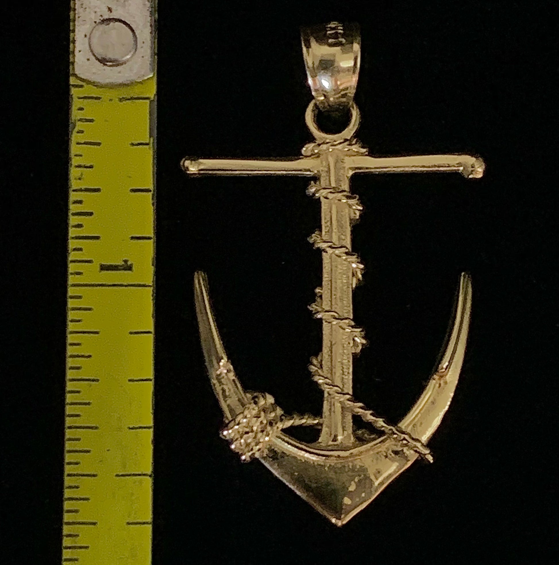 This unique anchor pendant is handmade in 14 Karat Yellow Gold with rope accents. Anchors have been used over centuries and are a popular nautical design in jewelry. They can symbolize stability, strength, and faith, among many other things.