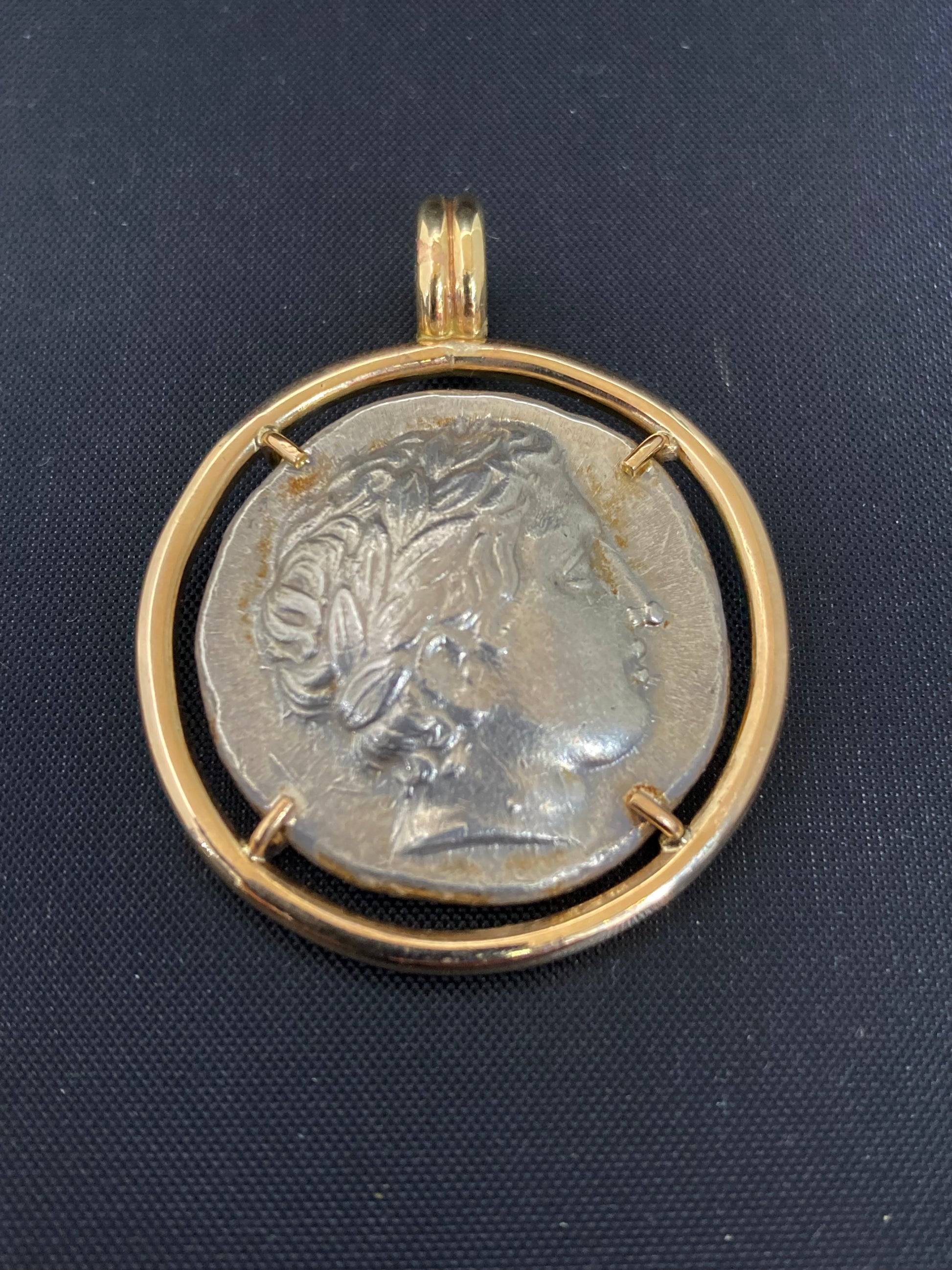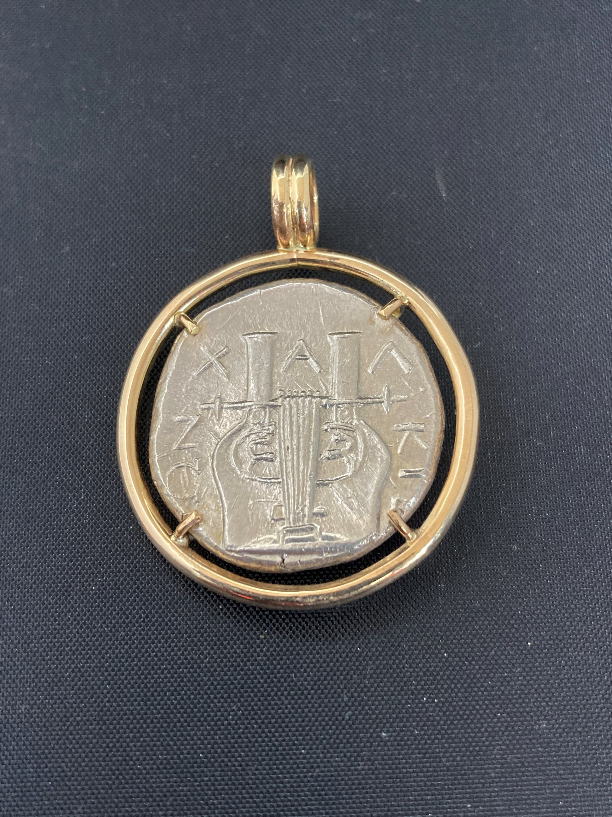 Mint: Olynthus, Chalcidian, Denomination: Tetradrachm, Obverse: Head of Apollo, Facing Right, Reverse: Kithara/Lyre, Frame: Handmade 14 Karat Gold Mounting