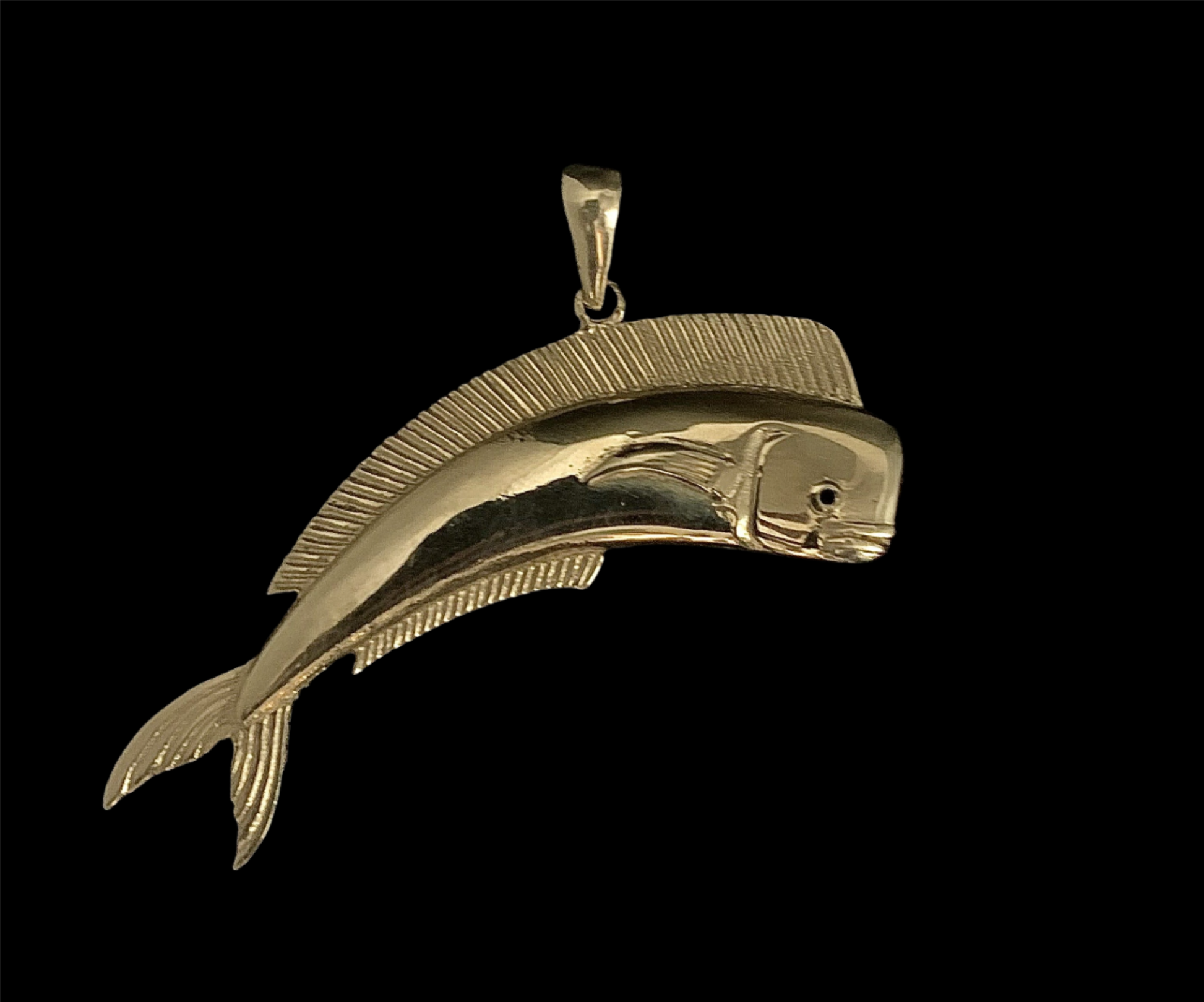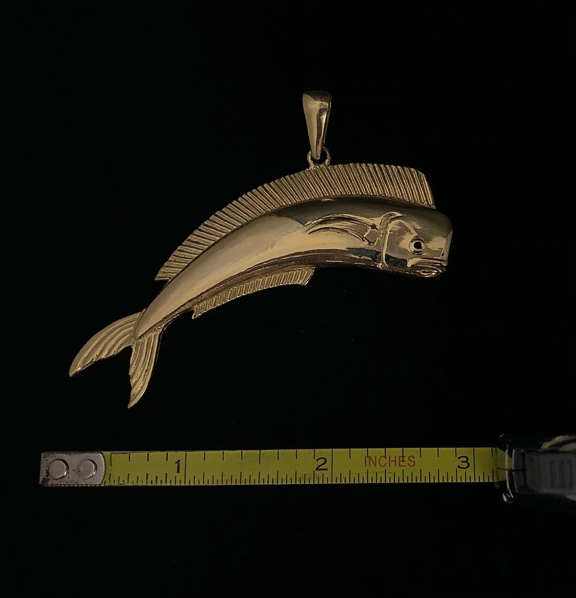 This handmade Mahi Mahi Pendant is cast in 14 Karat Yellow Gold. The pendant is hollow on the reverse side, so it will lay flat on your chest. From tail to head, the pendant measures about 3". The eye of the fish pendant is also hollow, so a gemstone can be added upon request. This fish is also known colloquially as Dolphin and Dorado.