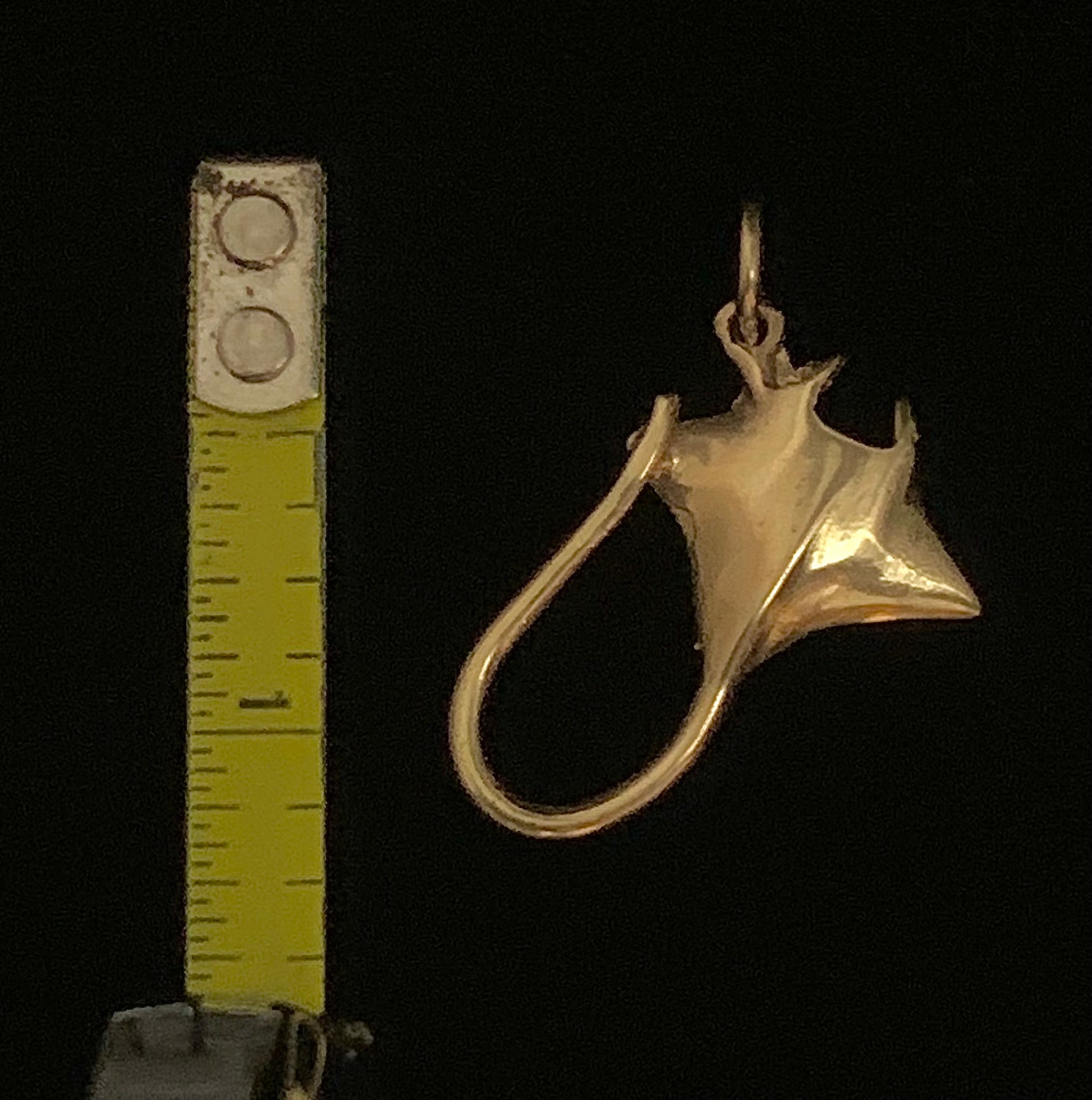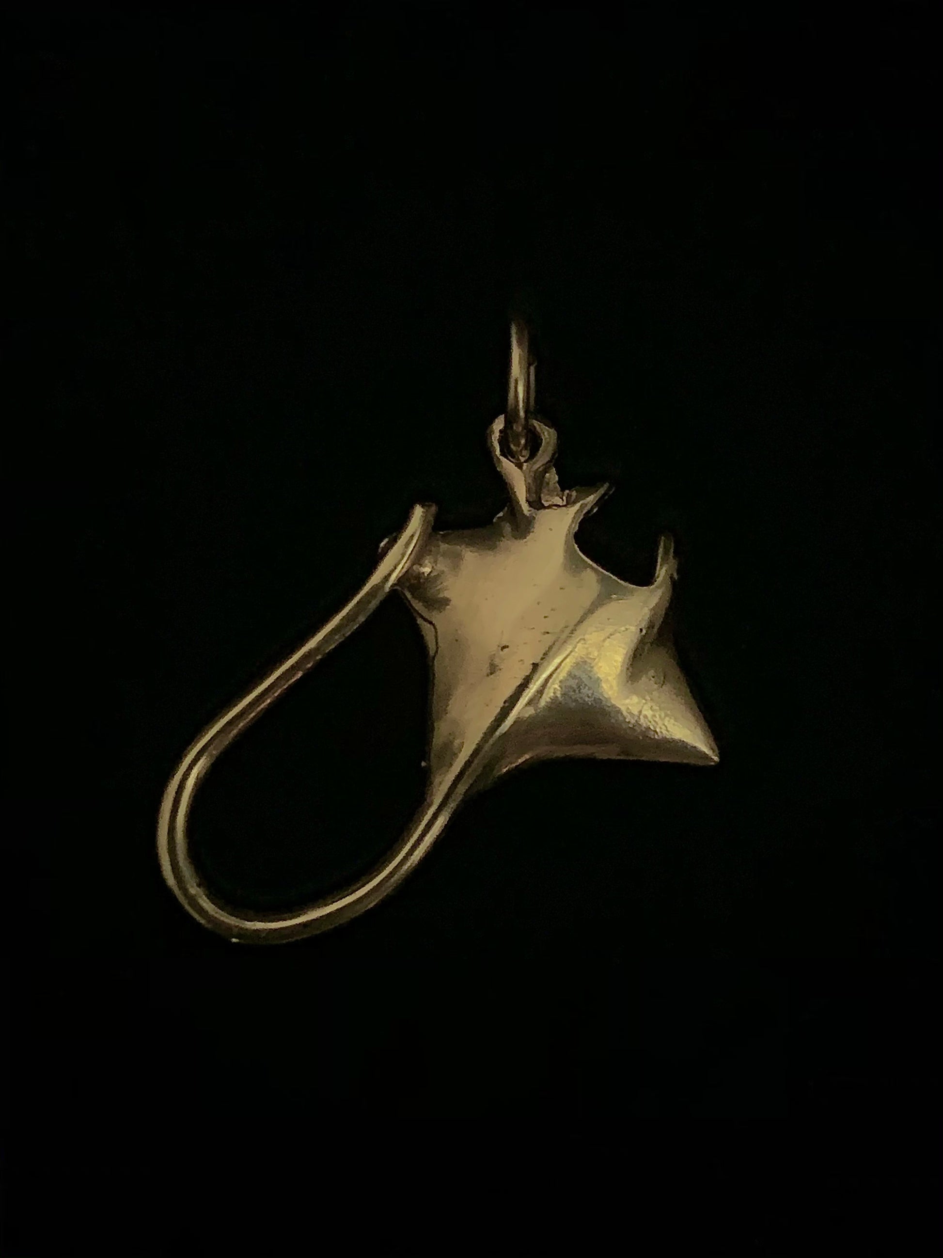 This handmade Manta Ray pendant is cast in solid 14 Karat Yellow Gold. The back of the ray pendant features lifelike gills on the belly. Manta Rays are found in tropical waters and are some of the largest animals in the ocean!