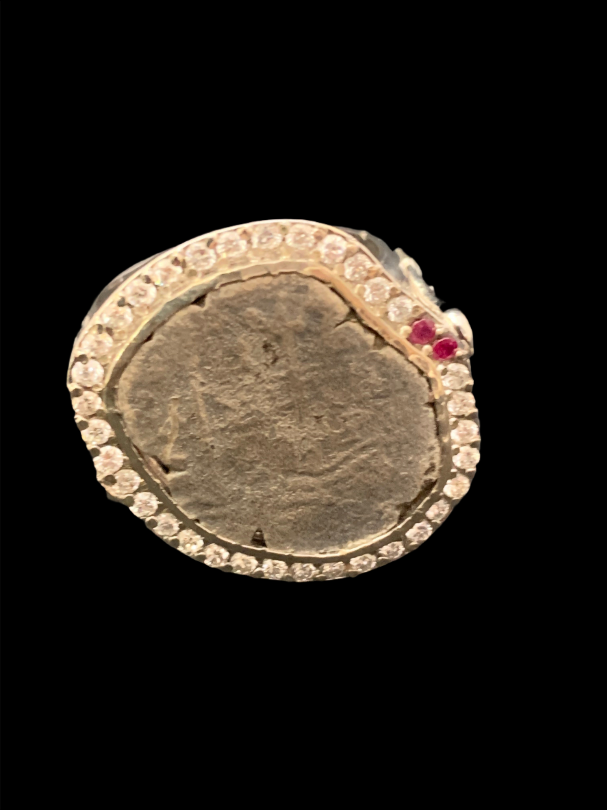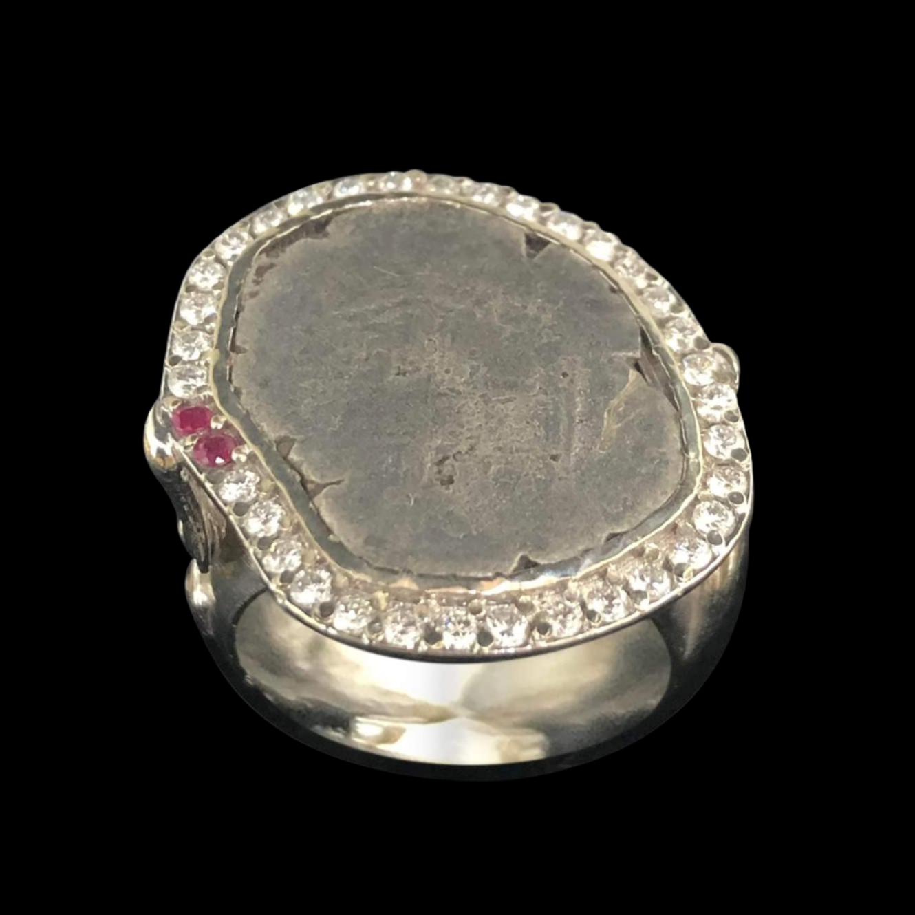 Framed in 14 Karat White Gold with a Halo of Diamonds around, two Rubies