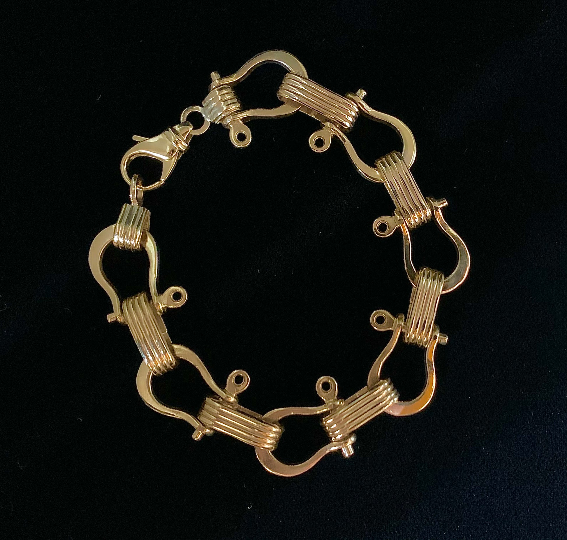 This Shackle Bracelet is made in solid 14 Karat Yellow Gold. Each link is handcrafted with care, so that this bracelet is made to last. The shackle is a link that fastens chains and loops together, usually on a boat. The symbol of the nautical shackle that has come to represent strength and durability.
