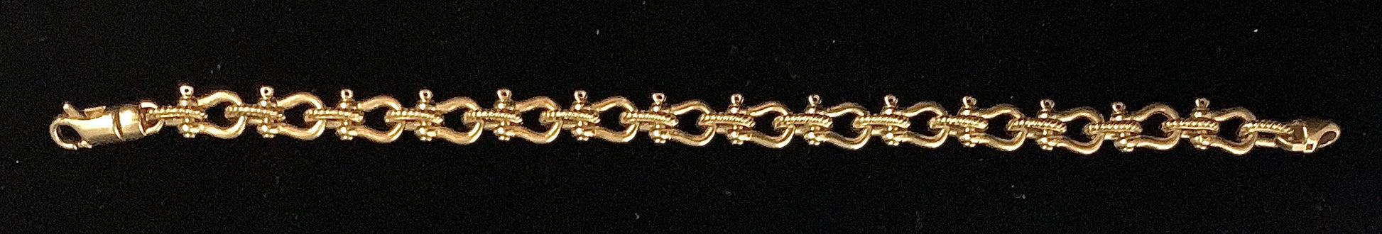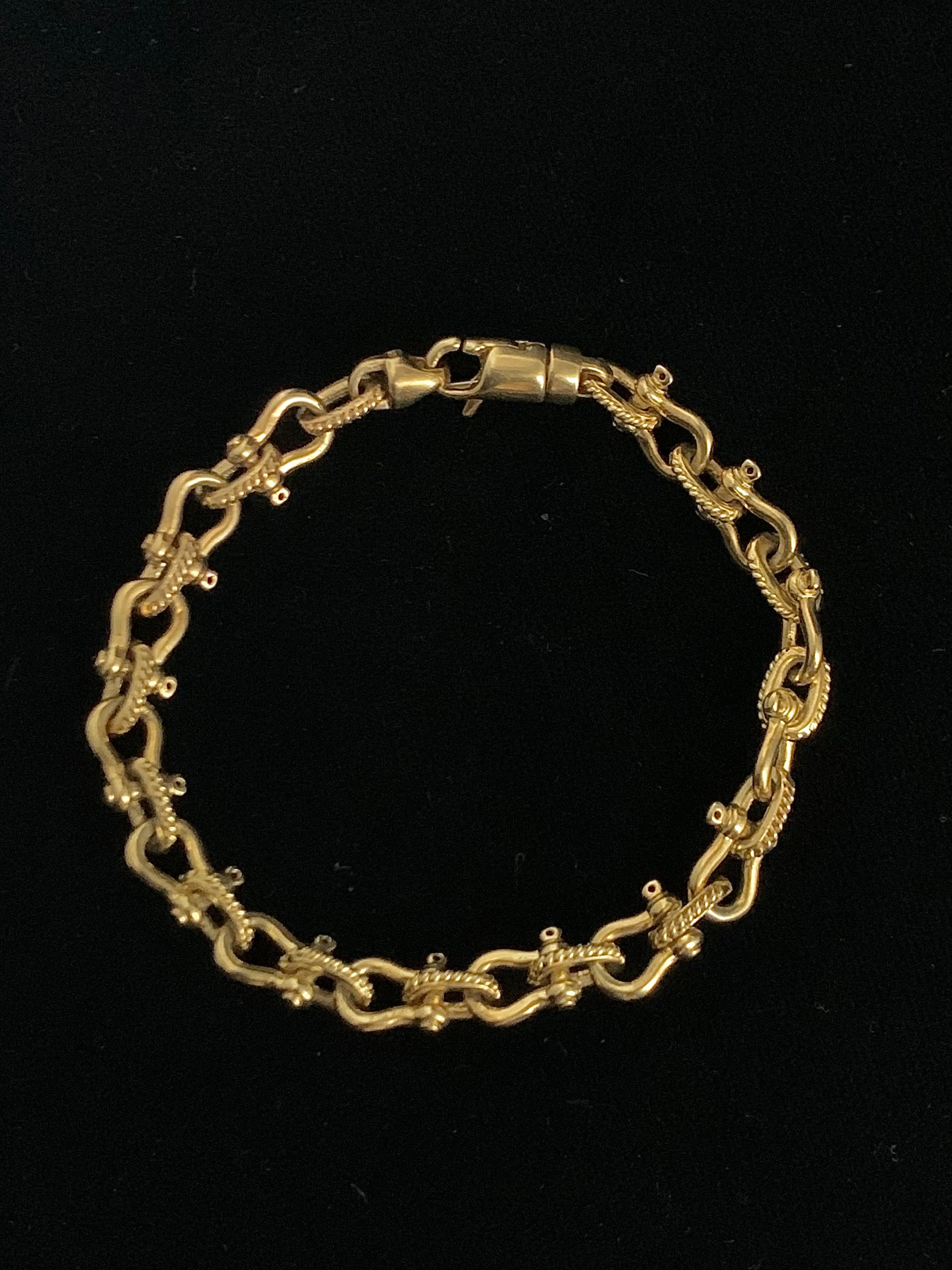 This Shackle Bracelet is made in solid 14 Karat Yellow Gold. Each link is handcrafted with care, so that this bracelet is made to last. The shackle is a link that fastens chains and loops together, usually on a boat. The symbol of the nautical shackle that has come to represent strength and durability.